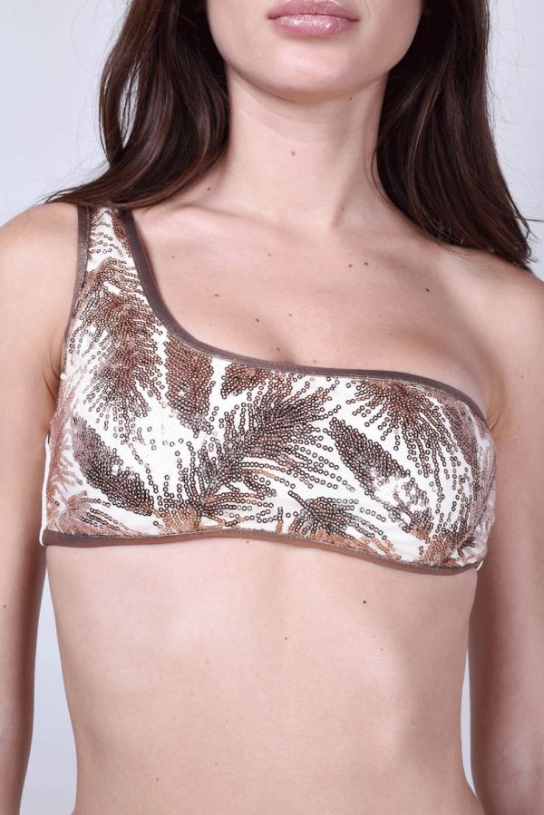 Bikini monospalla con coppe push-up. Slip con taglio a V con sgambatura brasiliana. La particolarità sta nel tessuto, ricamato con micropaillettes bronzo che vanno a disegnare diverse piume di varie grandezze.